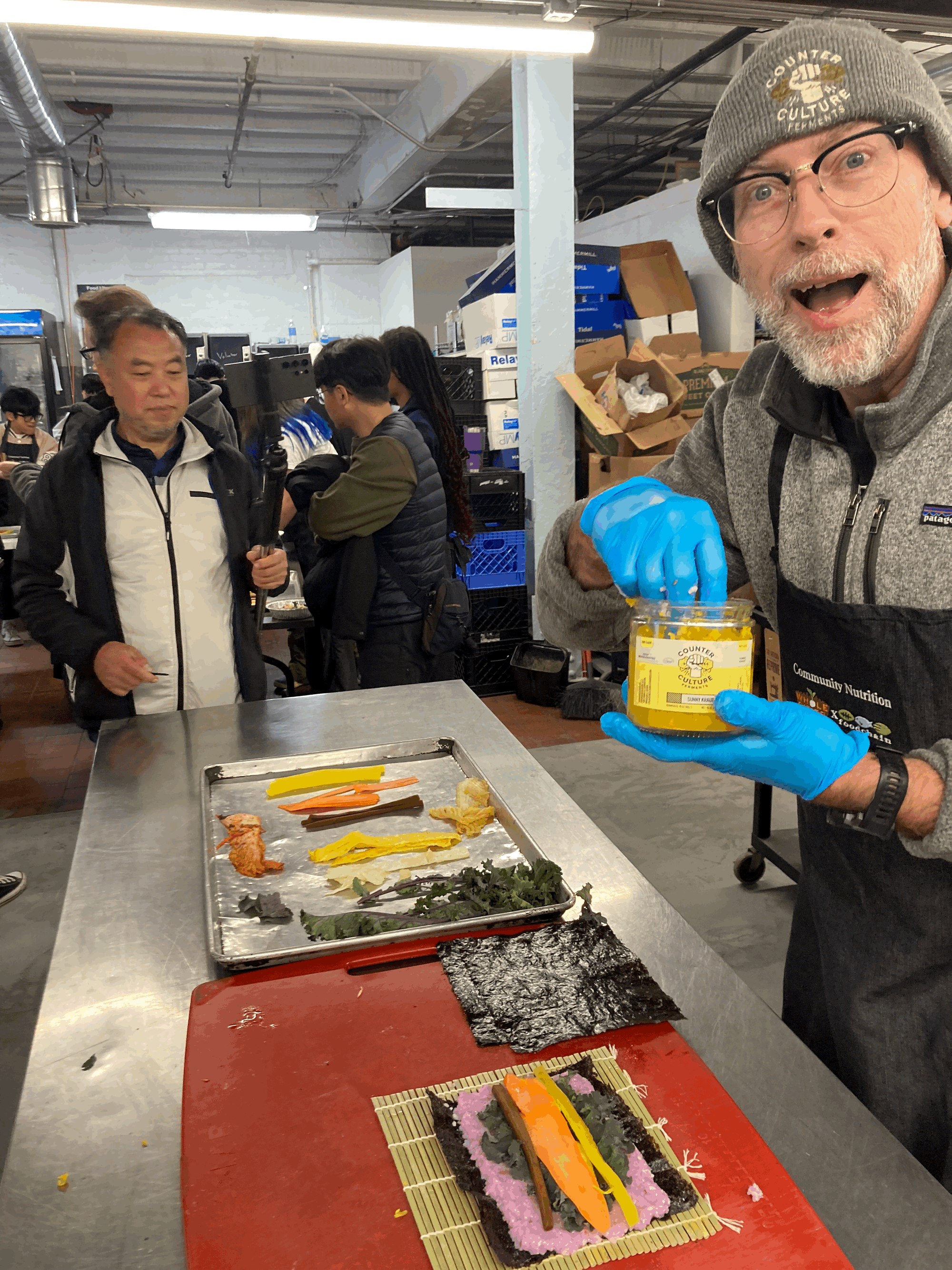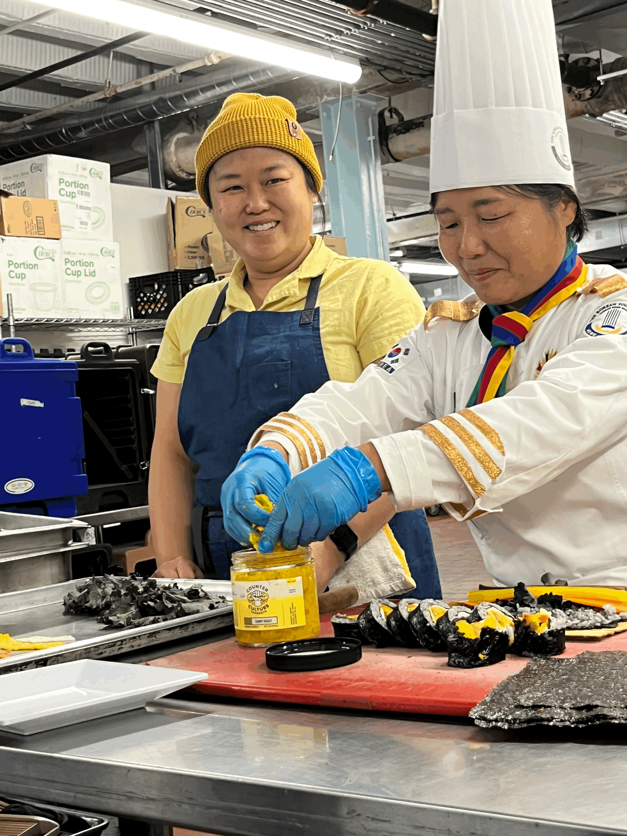 One highlight of our time together in Lexington was learning how to make Gimbap from Chun Ja Yoo, master chef of Korea known as the master chef of Gimbap in Korea. What a delight for Counterculture to share some of our ferments with her and see her smile and excitement when she tasted our Sunny Kraut. She loved the flavor, dipping her spoon in a second time just to drink more of Sunny brine and noting that the color was just perfect as a match for the traditional yellow fermented radish used in Korean Gimbap. She asked to bring jars to share with the community Gimbap class hosted by Foodchain and of course we said yes!